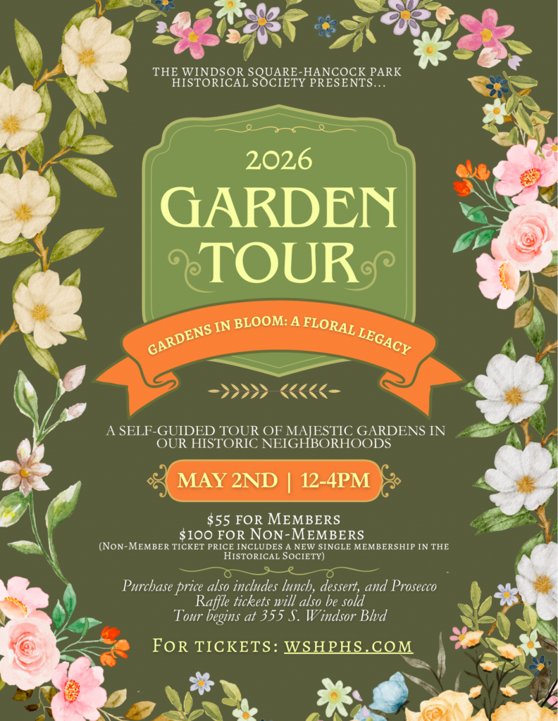 Please join us on Saturday, May 2nd, from 12:00 to 4:00 for the Windsor Square~Hancock Park Historical Society’s annual garden tour. This Spring’s theme is Gardens in Bloom: A Floral Legacy. Our members and guests will be treated to a selection of rarely seen private gardens in and around Windsor Square and Hancock Park. Our guests will also be treated to a smorgasbord of delicious delicacies for lunch, including dessert and Prosecco. An assortment of always-interesting raffle items will also be available for purchase. Tour begins at 355 S. Windsor Blvd. Please join us.
